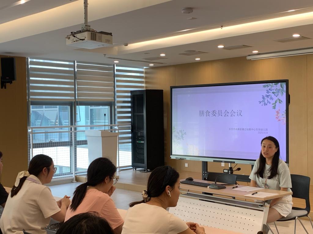 近日东郊幼儿园顺利召开了本学期膳食委员会会议。会议旨在进一步加强幼儿园膳食管理,深化家园合作,共同促进幼儿健康成长。园方领导、新任家委会成员、膳食监督委员会成员及后勤部门负责人共同出席了本次会议。