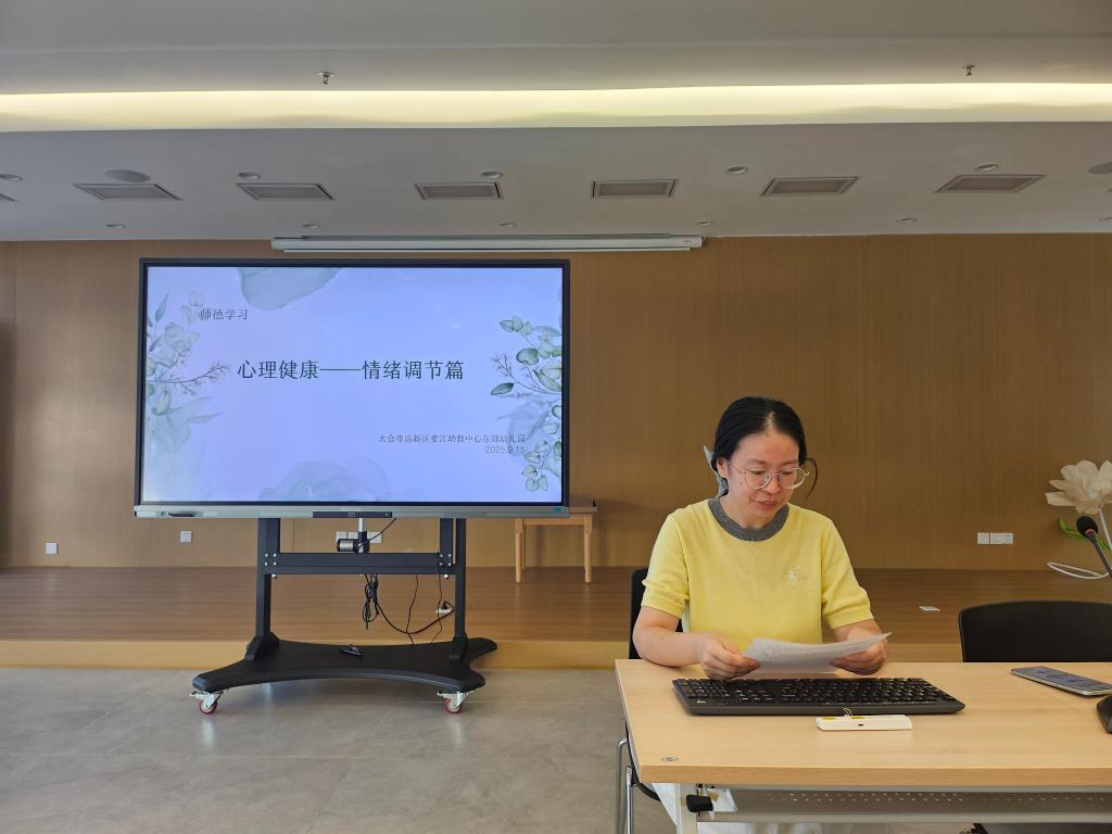 2025年9月15日下午16:10~17:10,太仓市高新区娄江幼教中心东郊幼儿园全体教师在二楼会议室开展“学习《心理健康-情绪调节篇》”师德培训活动。