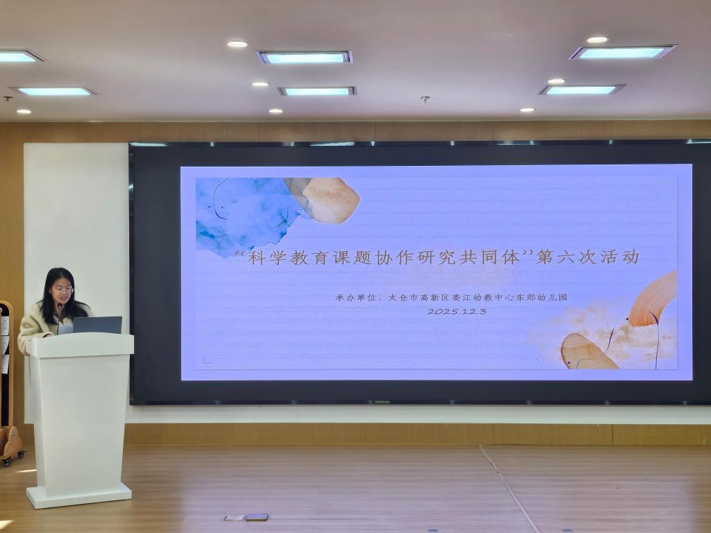 为落实太仓市教师发展中心关于科研课题协作研究共同体的建设要求,实现研究资源共享,提升幼儿科学教育研究的针对性与实效性,2025年12月3日下午,“科学教育课题协作研究共同体”暨“七个一”科教融合活动在太仓市高新区娄江幼教中心东郊幼儿园多功能室开展。科学教育课题协作研究共同体成员、东郊幼儿园课题核心组成员以及娄江幼教中心业务、各课题主持人参与本次活动。本次活动由东郊幼儿园园长吴花主持。