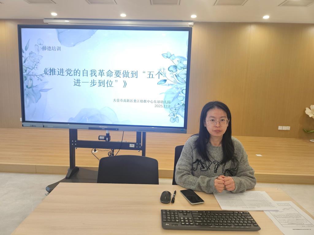 2025年12月8日下午16:10~17:10,太仓市高新区娄江幼教中心东郊幼儿园全体教师在二楼会议室开展《推进党的自我革命要做到“五个进一步到位”》师德培训活动。