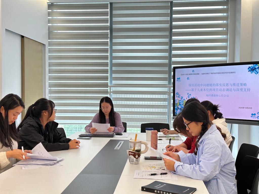 会议中,课题组成员首先围绕《基于项目活动的幼儿教师课程反思能力的提升路径》展开理论学习。首先,教师们围绕驱动性问题,根据照片、视频等资料介绍各个项目开展情况,分享活动过程中幼儿生成的预设之外的问题或兴趣。接着,教师们在落实问题链过程中,基于项目进展回溯进行集体诊断,对照幼儿实际表现,分析已实施的问题链是否有效,通过发展性分析,评估幼儿在核心经验与关键能力上获得的可见发展。最后,针对每个庭园项目,教师们共同商议优化策略,明确各项目活动下一阶段最关键的支持策略,填写《项目优化与推进计划》,明确后续关键活动及资源支持。